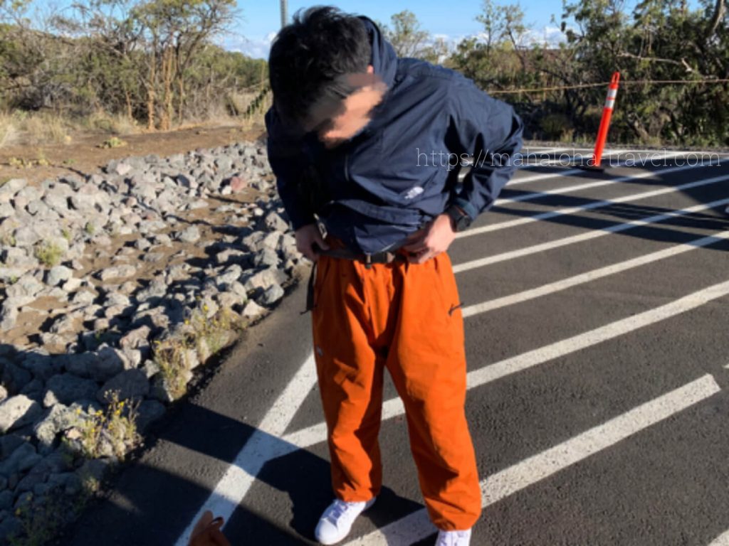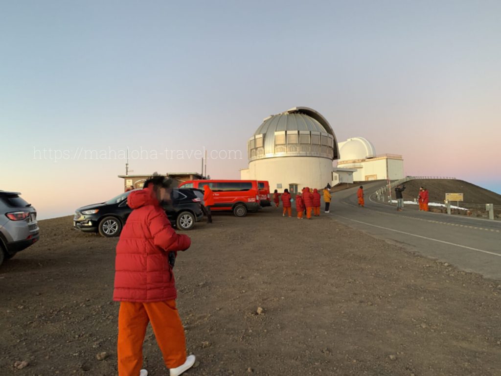 マウナケアを登る途中でどんどん寒くなっていきます。ツアー会社でスキーウエア(上下)のような防寒着を貸してくれますが、それだけではかなり寒いので、休憩所で長袖長ズボンなどに着替えるのをおすすめします。※スカートはおすすめできません。